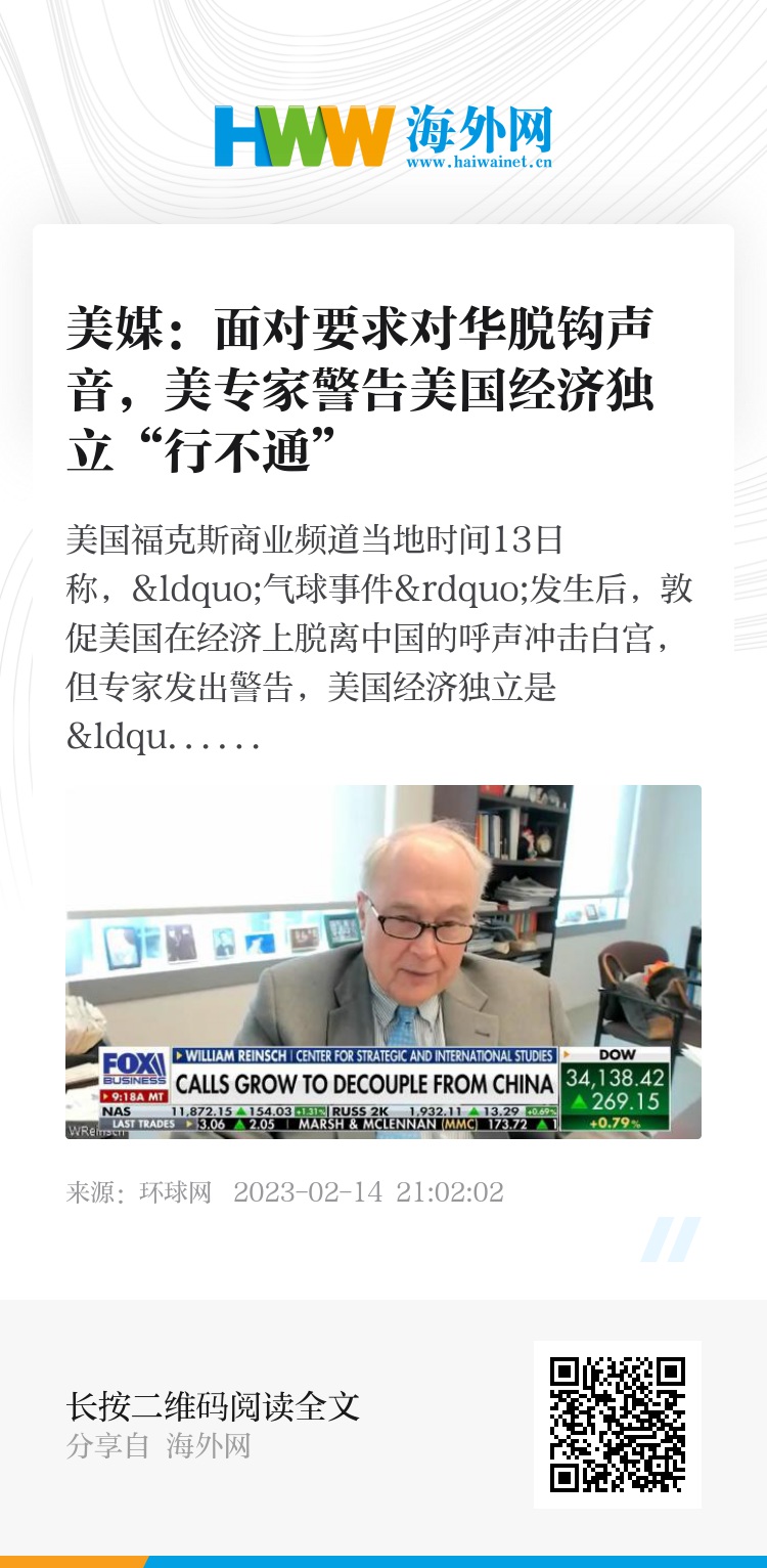 美国福克斯商业频道当地时间13日称,“气球事件”发生后,敦促美国在经济上脱离中国的呼声冲击白宫,但专家发出警告,美国经济独立是“行不通的”。