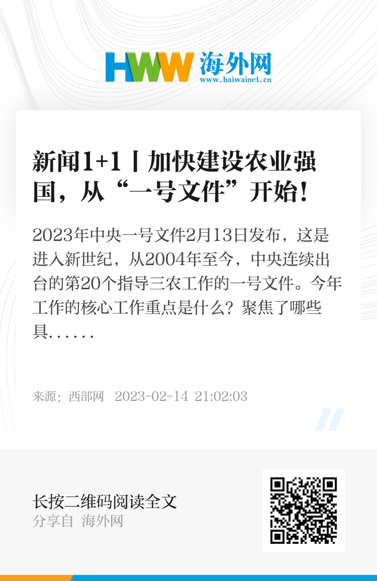 2023年中央一号文件2月13日发布,这是进入新世纪,从2004年至今,中央连续出台的第20个指导三农工作的一号文件。今年工作的核心工作重点是什么?聚焦了哪些具体问题?我们又该怎样筑牢现代化强国的根基,为农业强国的建设开好局,起好步?新闻1+1邀请中国人民大学经济学院院长刘守英,共同关注:加快建设农业强国,从“一号文件”开始。