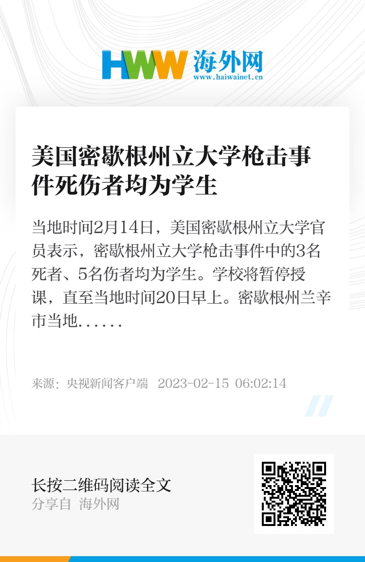 当地时间2月14日,美国密歇根州立大学官员表示,密歇根州立大学枪击事件中的3名死者、5名伤者均为学生。学校将暂停授课,直至当地时间20日早上。密歇根州兰辛市当地医院的一名医疗官表示,5名伤者目前仍处于危急状态。