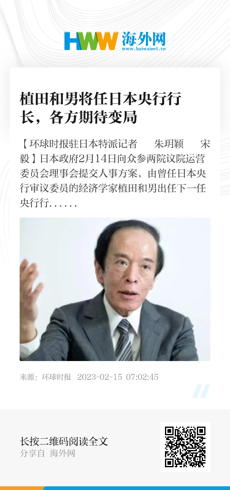 【环球时报驻日本特派记者 朱玥颖 宋 毅】日本政府2月14日向众参两院议院运营委员会理事会提交人事方案,由曾任日本央行审议委员的经济学家植田和男出任下一任央行行长,接替将于4月8日任期结束的现任行长黑田东彦。2名副行长人选分别是前金融厅长官冰见野良三和央行理事内田真一。经众参两院批准后,行长与副行长将分别于4月9日和3月20日就任,任期均为5年。