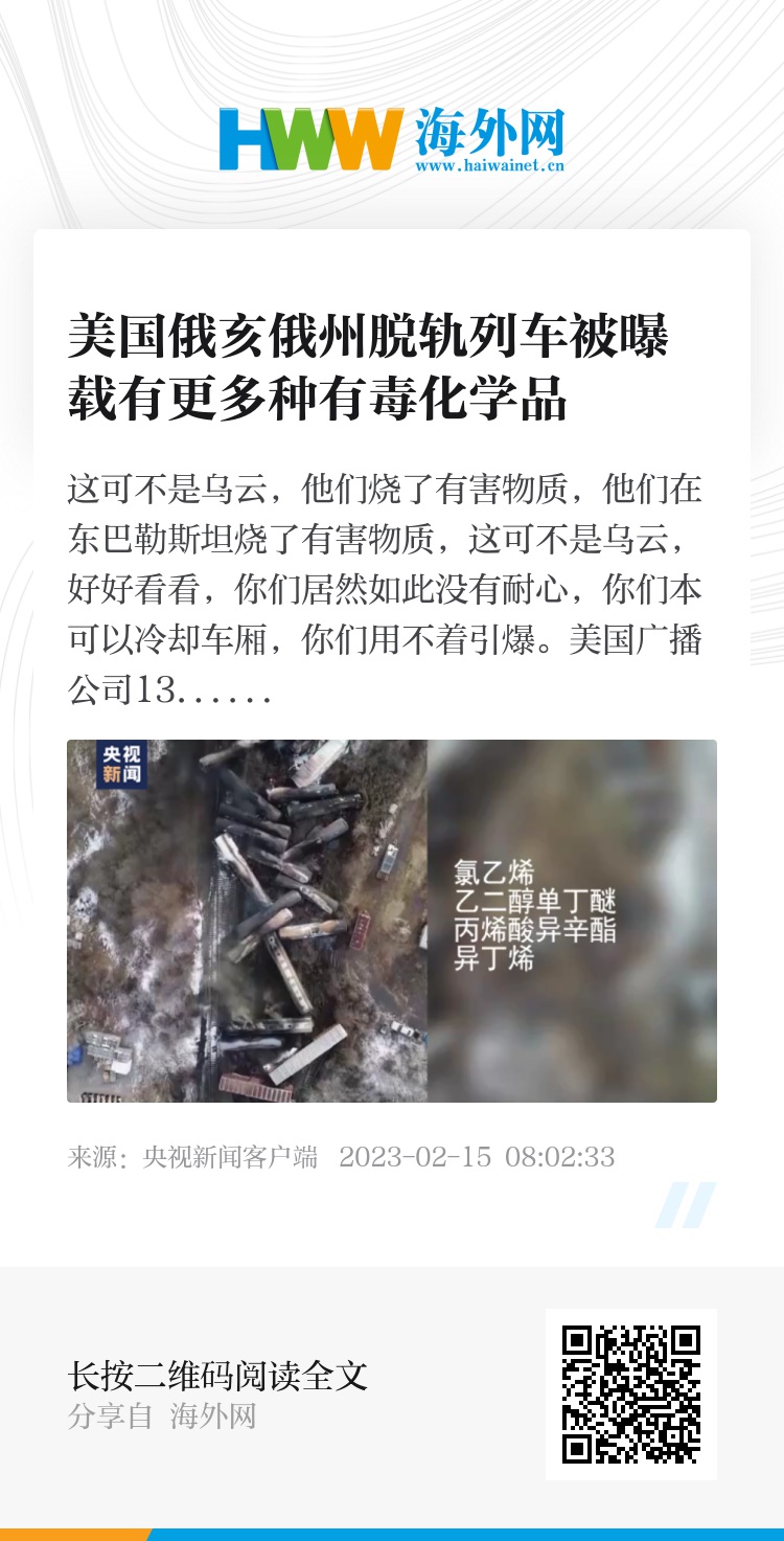 美国广播公司13日报道称,脱轨列车的运营商诺福克南方公司公布了新的数据,列出了脱轨列车上装载的有毒化学品的种类。除了此前公布的氯乙烯外,脱轨列车上还装载有乙二醇单丁醚,丙烯酸异辛酯,异丁烯等有毒化学品。