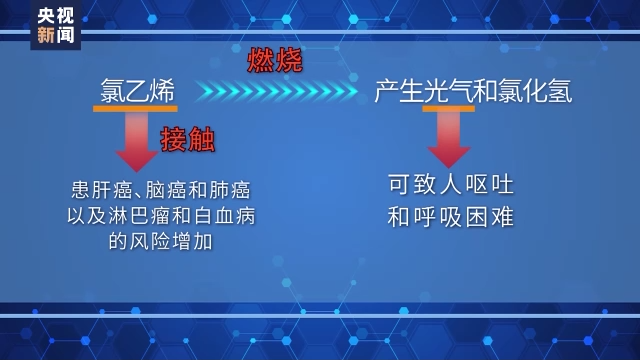 更让当地居民担忧的是空气中可能弥漫的有毒物质。氯乙烯燃烧时可产生光气和氯化氢。光气是一种剧毒气体,可致人呕吐和呼吸困难。美国国家癌症研究所称,接触氯乙烯会增加患肝癌、脑癌和肺癌以及淋巴瘤和白血病的风险。