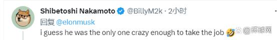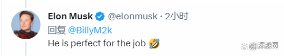 “它非常适合这份工作。”马斯克回复网友称。他还继续发推说,“比其他家伙强多了!”
