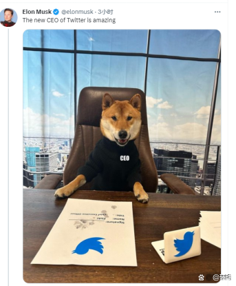 马斯克15日发推称,“推特新任CEO太棒了”。在配图上,一只穿着印有“CEO”字样的狗坐在办公桌前,桌上的CEO签名文件上写有名字“弗洛基”(Floki),还有几个“狗爪印”。
