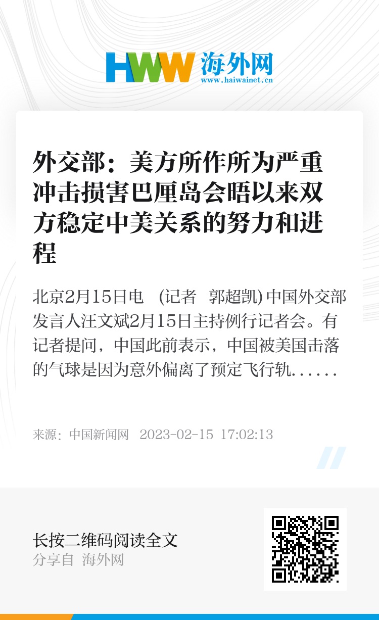 汪文斌:中国民用无人飞艇误入美国领空,完全是由不可抗力导致的意外、偶发事件,事实一清二楚,不容歪曲抹黑。但美方置若罔闻,执意对即将离开美领空的民用飞艇滥用武力,明显反应过度,严重违反国际法精神和国际惯例。