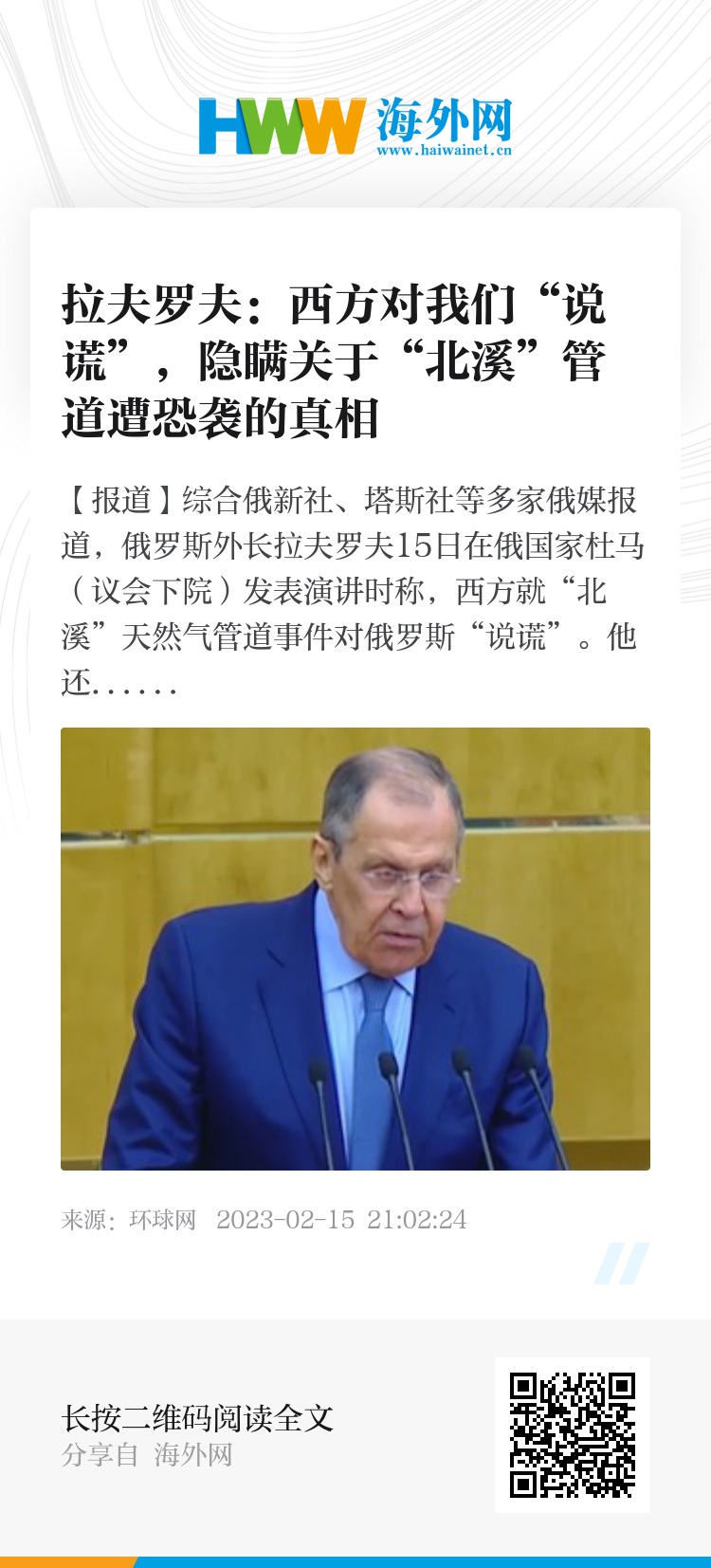 【环球网报道】综合俄新社、塔斯社等多家俄媒报道,俄罗斯外长拉夫罗夫15日在俄国家杜马(议会下院)发表演讲时称,西方就“北溪”天然气管道事件对俄罗斯“说谎”。他还称,俄罗斯正准备要求联合国安理会就调查“北溪”事件召开特别会议。