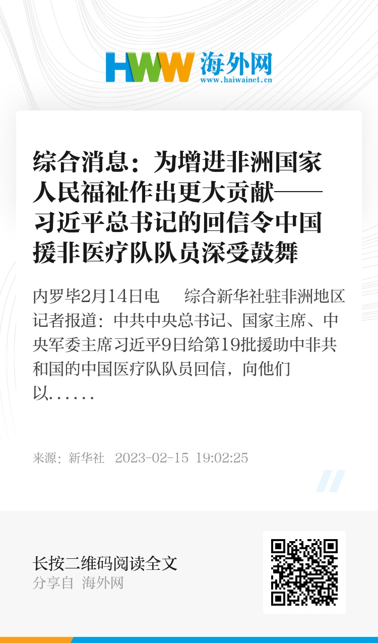 新华社内罗毕2月14日电 综合新华社驻非洲地区记者报道:中共中央总书记、国家主席、中央军委主席习近平9日给第19批援助中非共和国的中国医疗队队员回信,向他们以及广大援外医疗队员致以问候并提出殷切期望。
