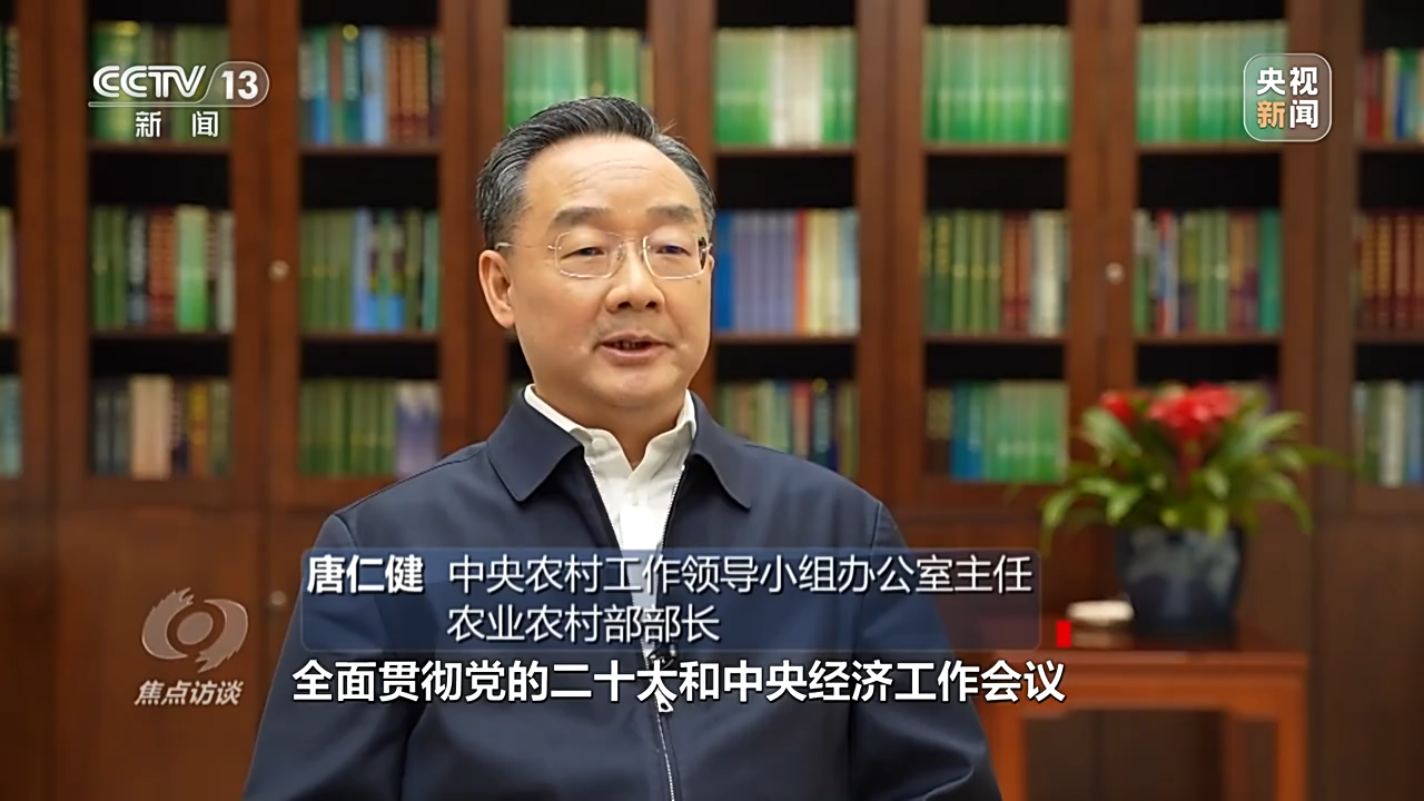 中央农村工作领导小组办公室主任、农业农村部部长 唐仁健:今年的中央一号文件全面贯彻党的二十大和中央经济工作会议、中央农村工作会议精神,深入贯彻落实习近平总书记关于“三农”工作的重要论述,聚焦全面推进乡村振兴主题,锚定建设农业强国目标,立足当前,部署乡村振兴年度性工作任务,强调坚决守牢确保国家粮食安全、防止发生规模性返贫等底线,扎实推进乡村发展、乡村建设、乡村治理等重点工作。