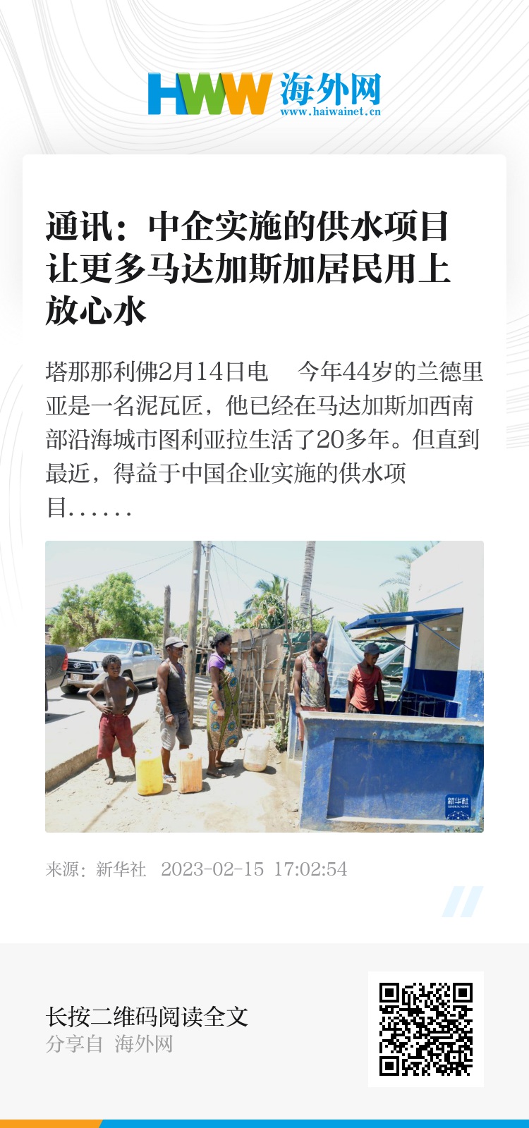 新华社塔那那利佛2月14日电 今年44岁的兰德里亚是一名泥瓦匠,他已经在马达加斯加西南部沿海城市图利亚拉生活了20多年。但直到最近,得益于中国企业实施的供水项目,他家里才装上自来水设施,实现了足不出户用上放心水的愿望。