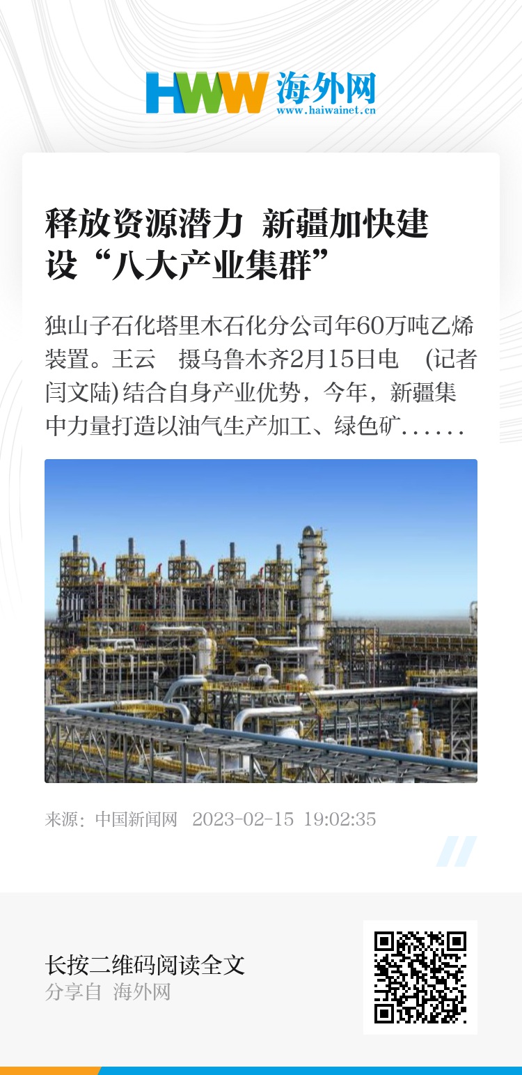 中新网乌鲁木齐2月15日电 (记者 闫文陆)结合自身产业优势,今年,新疆集中力量打造以油气生产加工、绿色矿业、新能源新材料等”八大产业集群“为支撑的现代化产业体系,以期充分释放资源潜力,建设具有新疆特色的现代化产业体系。