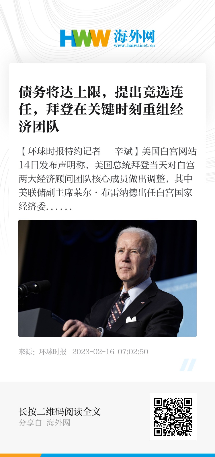 【环球时报特约记者 辛斌】美国白宫网站14日发布声明称,美国总统拜登当天对白宫两大经济顾问团队核心成员做出调整,其中美联储副主席莱尔·布雷纳德出任白宫国家经济委员会主任,贾里德·伯恩斯坦出任白宫经济顾问委员会主席。除上述任命外,拜登还宣布了另外三项任命,包括白宫国家经济委员会副主任巴拉特·拉马穆提将兼任战略经济沟通顾问等。多家媒体提到,当下是个关键时间节点,一是美国面临的债务上限危机,二是拜登将提出竞选连任。