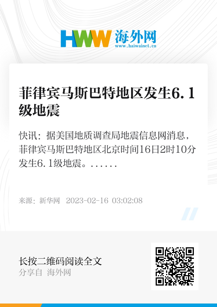 新华社快讯:据美国地质调查局地震信息网消息,菲律宾马斯巴特地区北京时间16日2时10分发生6.1级地震。