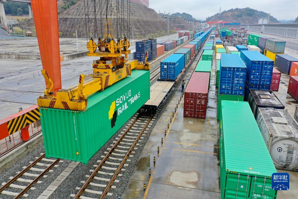 一列中欧班列在贵阳国际陆港都拉营站装载集装箱(2月9日摄,无人机照片)。新华社记者 刘续 摄