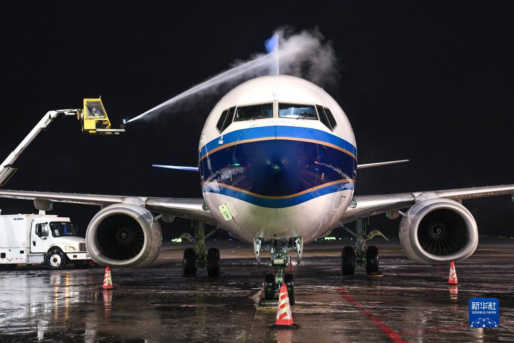 南方航空的机务人员在贵阳龙洞堡国际机场进行除防冰作业(1月17日摄)。新华社记者 杨文斌 摄