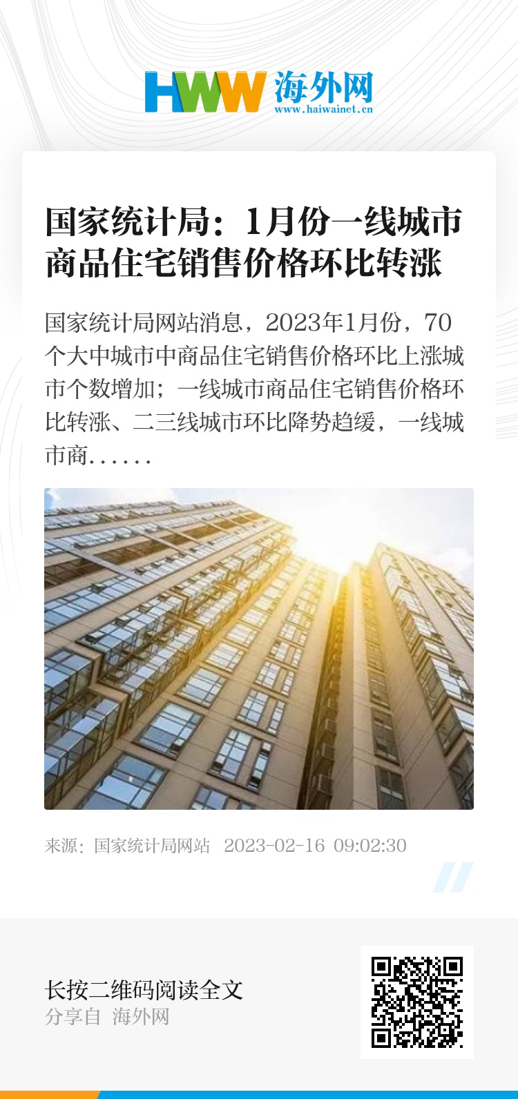 国家统计局网站消息,2023年1月份,70个大中城市中商品住宅销售价格环比上涨城市个数增加;一线城市商品住宅销售价格环比转涨、二三线城市环比降势趋缓,一线城市商品住宅销售价格同比上涨、二三线城市同比下降。