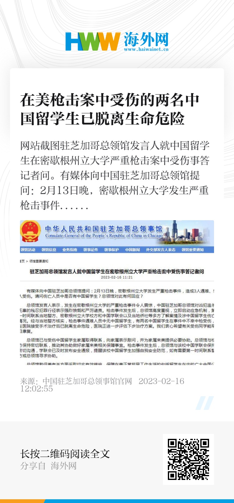 总领馆发言人表示,发生在密歇根州立大学的严重枪击事件令人震惊,中国驻芝加哥总领馆对凶犯滥杀无辜的残忍犯罪行径表示强烈愤慨和严厉谴责。枪击事件发生后,总领馆高度重视,立即启动应急机制,第一时间联系当地警方、密歇根州立大学校方和中国学联会以及当地侨社等多方了解案情及涉中国留学生伤亡情况。经与当地警方核实,枪击事件遇难人员中无中国留学生,有两名中国留学生在事件中不幸中枪受伤,在医院接受手术治疗后已脱离生命危险,医院正进一步评估下步治疗方案。我们衷心希望有关受伤同学能早日康复。