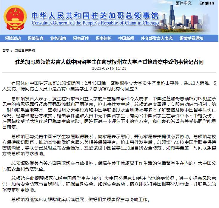 有媒体向中国驻芝加哥总领馆提问:2月13日晚,密歇根州立大学发生严重枪击事件,造成3人遇难、5人受伤。请问伤亡人员中是否有中国留学生?总领馆对此有何回应?