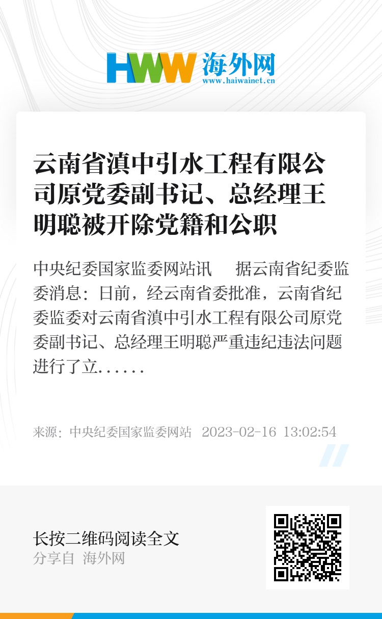 中央纪委国家监委网站讯 据云南省纪委监委消息:日前,经云南省委批准,云南省纪委监委对云南省滇中引水工程有限公司原党委副书记、总经理王明聪严重违纪违法问题进行了立案审查调查。