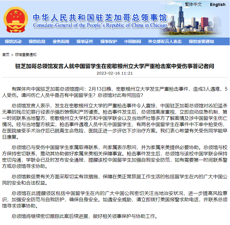 总领馆发言人表示,发生在密歇根州立大学的严重枪击事件令人震惊,中国驻芝加哥总领馆对凶犯滥杀无辜的残忍犯罪行径表示强烈愤慨和严厉谴责。
