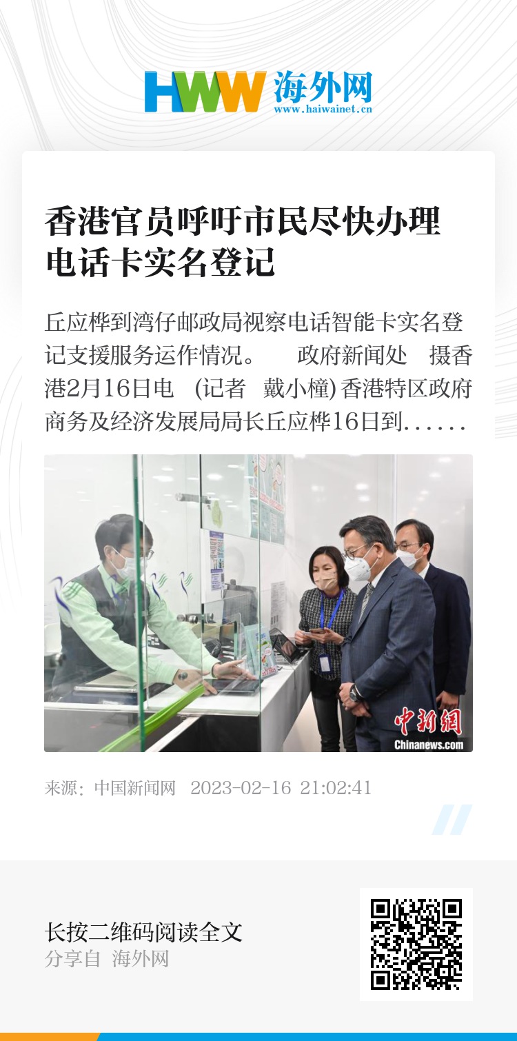 中新网香港2月16日电 (记者 戴小橦)香港特区政府商务及经济发展局局长丘应桦16日到湾仔邮政局视察电话智能卡实名登记支援服务运作情况时,呼吁市民尽快完成电话卡实名登记。