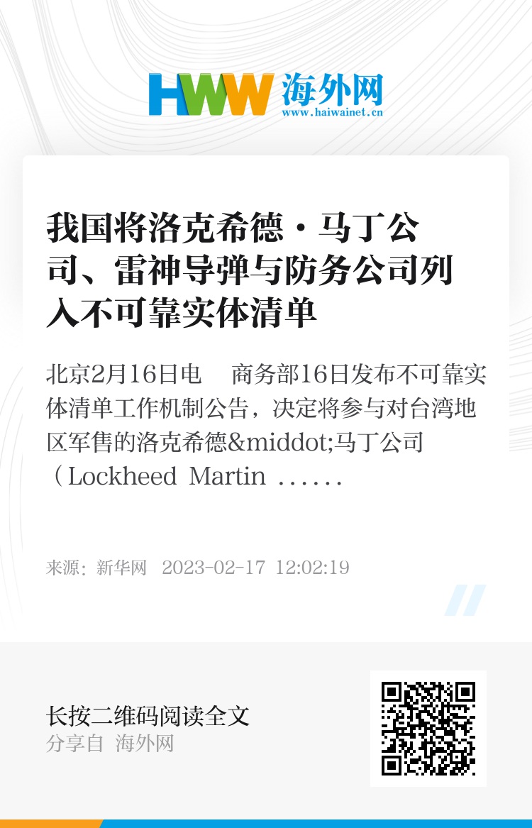 新华社北京2月16日电 商务部16日发布不可靠实体清单工作机制公告,决定将参与对台湾地区军售的洛克希德·马丁公司(Lockheed Martin Corporation)、雷神导弹与防务公司(Raytheon Missiles &Defense)列入不可靠实体清单。