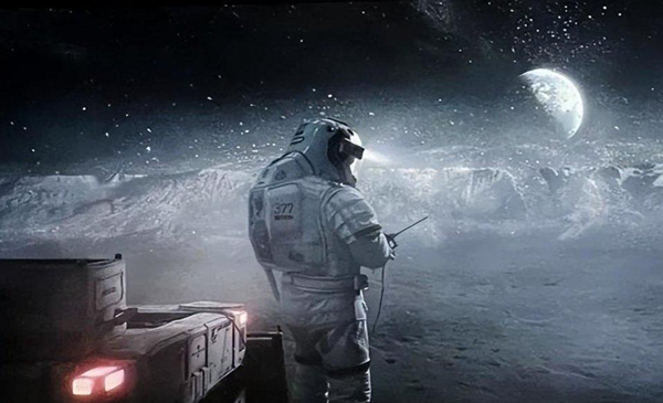 电影《流浪地球2》中,中国航天员在月球上手握核弹爆发器,眺望地球。