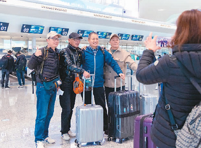 2月8日,前往印尼巴厘岛的旅行团游客在浙江杭州萧山国际机场T4航站楼拍照留念。