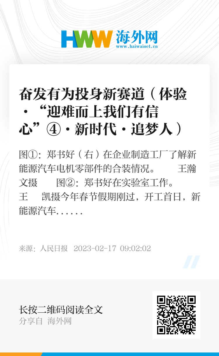 新一年,新的目标。郑书好对投身新能源汽车新赛道更加坚定:“发展新能源汽车是我国从汽车大国迈向汽车强国的必由之路。政策支持强劲、市场需求旺盛,我们正处在一个新能源汽车发展的最好时代,作为新能源汽车工程师,我将更加主动投身电动化、智能化、全球化的洪流,不断加快技术创新,为推动产业高质量发展贡献力量。”(本报记者 韩 鑫)