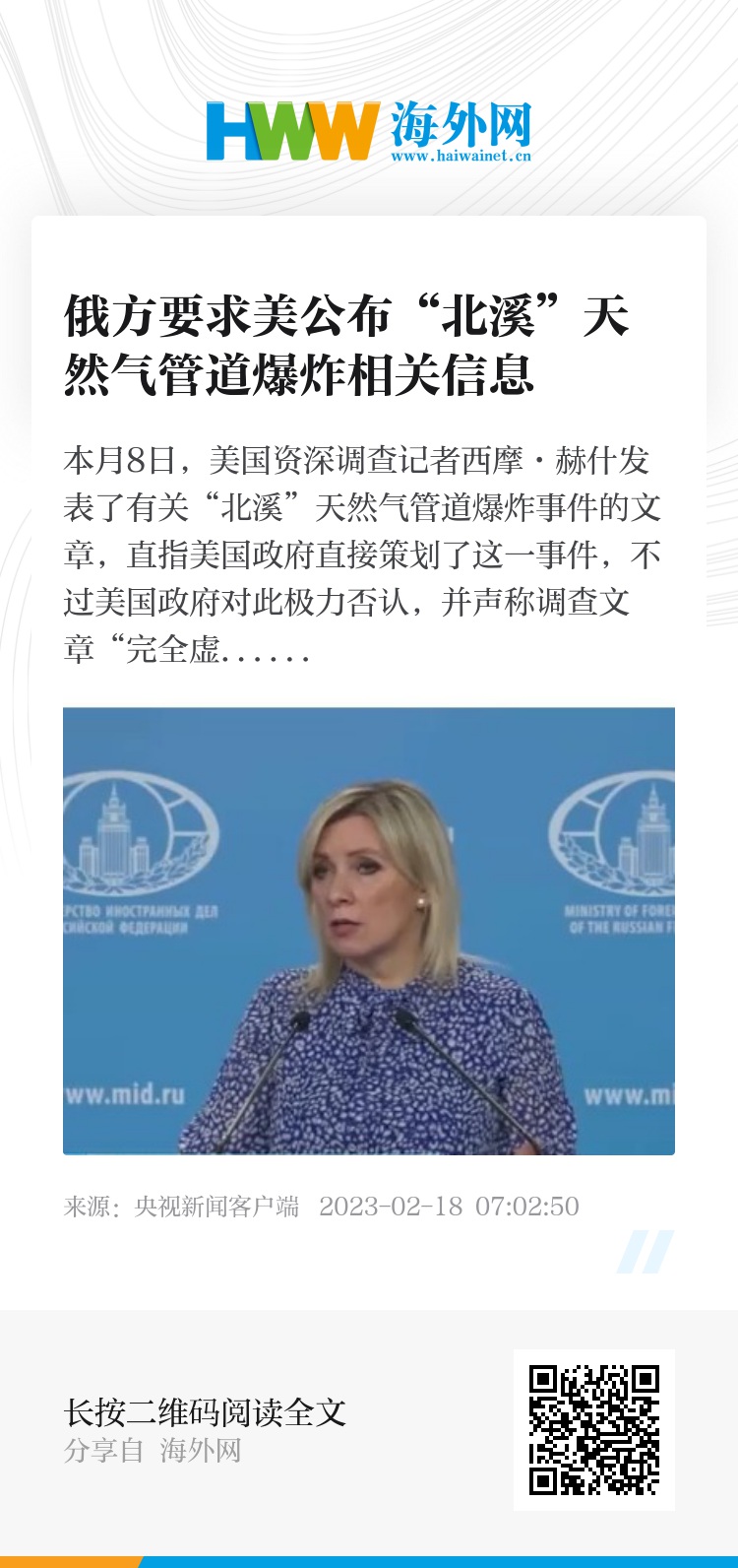 俄罗斯外交部发言人 扎哈罗娃:“北溪”管道爆炸发生在北约军队控制区域内,谁在掌管这一联盟呢,是美国。这一地区遍布侦察设备和军事设施,请问美国政府那里发生了什么呢?如果(赫什)公布的文章和数据对美方来说没有价值,那么美国有责任公布自己搜集到的信息并且在公布时要有事实和数据来支撑,美国有这些数据。