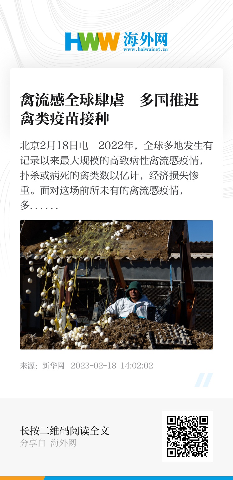 新华社北京2月18日电 2022年,全球多地发生有记录以来最大规模的高致病性禽流感疫情,扑杀或病死的禽类数以亿计,经济损失惨重。面对这场前所未有的禽流感疫情,多国政府开始考虑扑杀和隔离以外的另一种选项:为家禽接种禽流感疫苗。