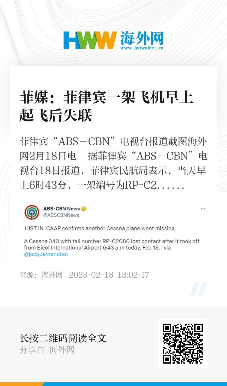 海外网2月18日电 据菲律宾“ABS-CBN”电视台18日报道,菲律宾民航局表示,当天早上6时43分,一架编号为RP-C2080的塞斯纳340型飞机从菲律宾比科尔国际机场起飞后失联。