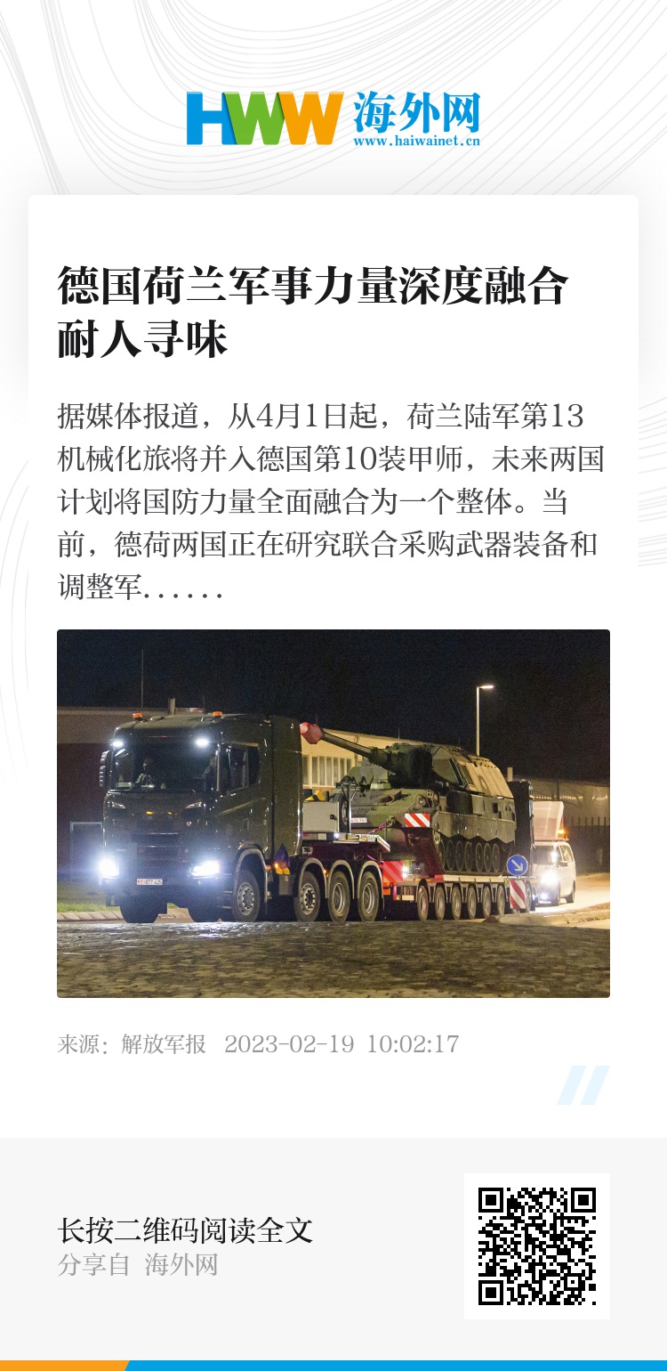据媒体报道,从4月1日起,荷兰陆军第13机械化旅将并入德国第10装甲师,未来两国计划将国防力量全面融合为一个整体。当前,德荷两国正在研究联合采购武器装备和调整军事法规的相关问题,以确保实现“兼容和互补”。今后,两国还打算在现有“联合部队”基础上,组建一支总兵力5万的步兵联合部队。