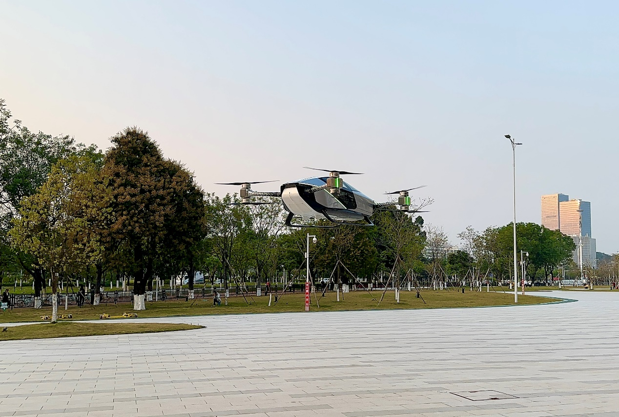 17日,在广东广州番禹区,当旅航者X2缓缓起飞时,曾经在科幻电影里现身的“飞行汽车”,从梦想照进了现实。图为小鹏汇天旅行者X2双人智能电动飞行器试飞。(海外网张荣耀 摄)