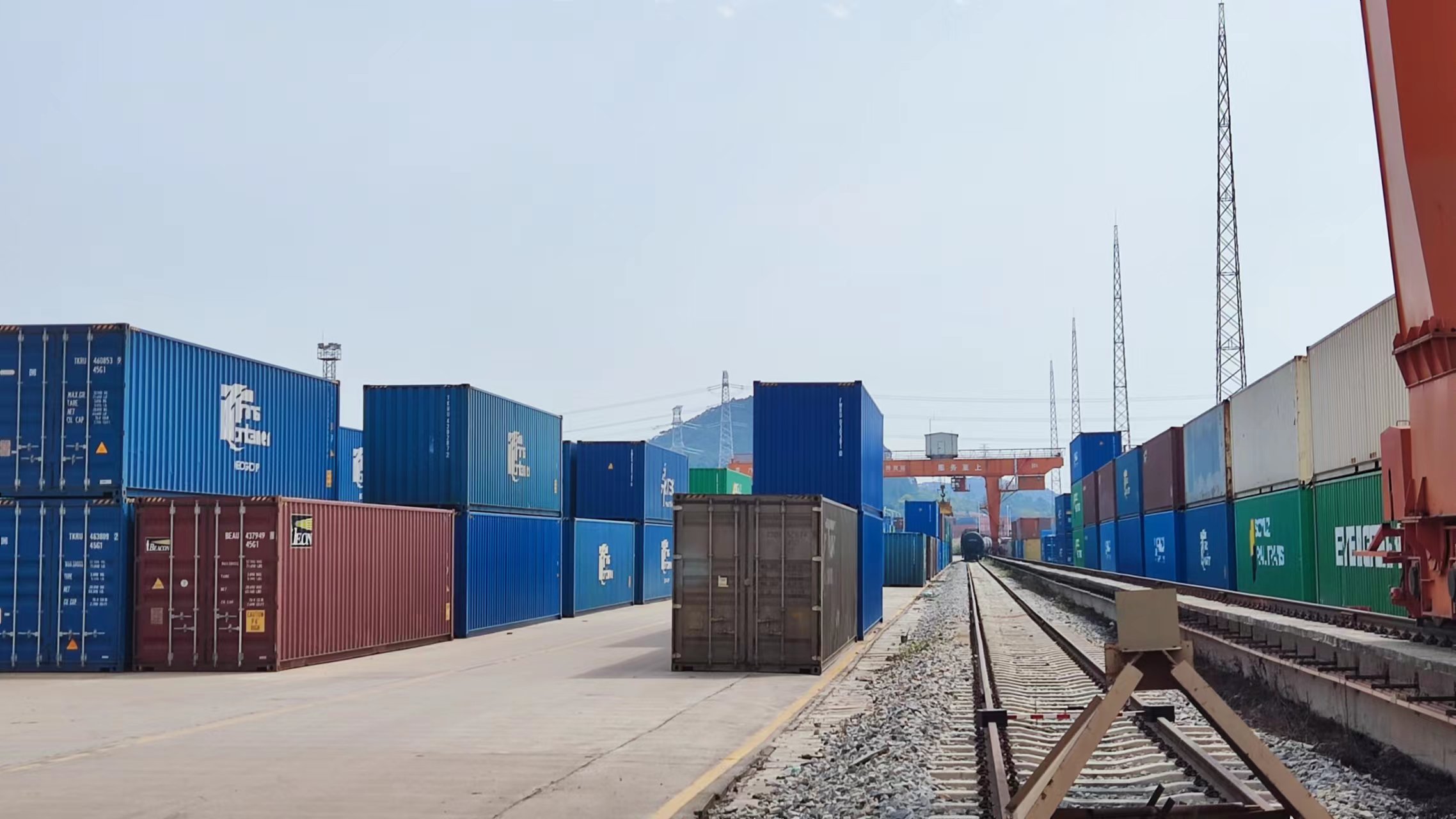 广州东部公铁联运枢纽项目一期是国家级重大建设项目,是广州市4个国家级物流枢纽之一,定位为“通道+枢纽+产业”枢纽经济示范项目。19日,采访团来到位于广州增城区广州东部公铁联运枢纽,实地探访这个打造中的粤港澳大湾区国际班列集结中心。图为广州东部公铁联运枢纽内存放的集装箱。(海外网张荣耀 摄)