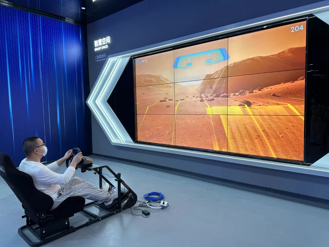 屏宇宙中体验未来是怎样感受?18日下午,采访团来到广州黄埔TCL华星广州t9项目现场,看广州如何打造“世界显示之都”。 TCL华星广州t9项目全称广州华星第8.6代氧化物半导体新型显示器件生产线项目,是目前全球唯一兼容LCD/Micro LED/IJP OLED的高世代面板产线。图为记者进行显示屏场景体验。(海外网张荣耀 摄)