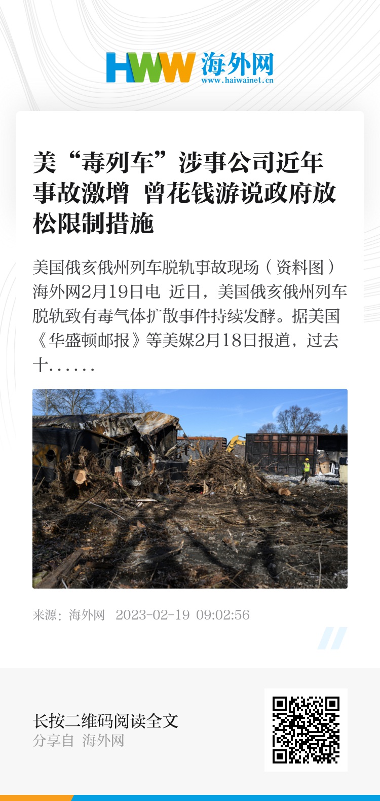 美媒称,诺福克南方铁路公司是美国第四大铁路公司,2022年收入达到创纪录的127亿美元。值得注意的是,该公司一直在投入资金,以游说联邦政府放宽铁路限制措施。2022年,该公司曾花费180万美元游说美国交通部、联邦铁路管理局和白宫,并向国会议员捐款130万美元。专精事故方面官司的美国律师艾米丽·罗克表示,“列车不会意外脱轨,事实就是铁路公司会游说国会把标准降得越来越低。”