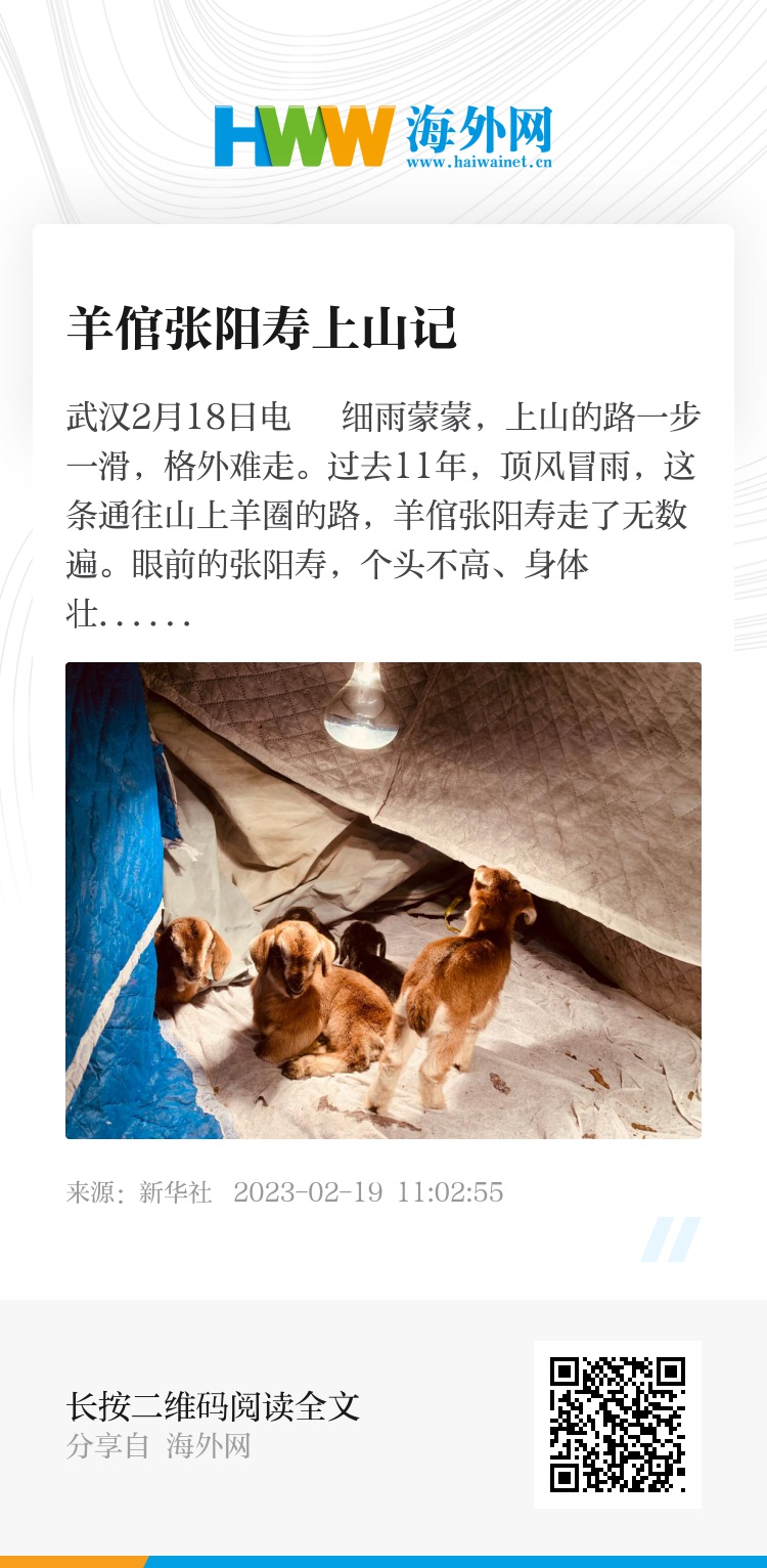 新华社武汉2月18日电 细雨蒙蒙,上山的路一步一滑,格外难走。过去11年,顶风冒雨,这条通往山上羊圈的路,羊倌张阳寿走了无数遍。