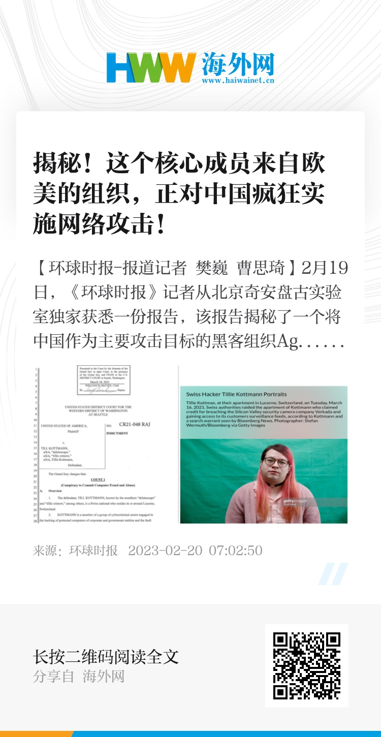 【环球时报-环球网报道记者 樊巍 曹思琦】2月19日,《环球时报》记者从北京奇安盘古实验室独家获悉一份报告,该报告揭秘了一个将中国作为主要攻击目标的黑客组织AgainstTheWest(下称“ATW”)的详情内幕。该组织核心成员来自于欧洲、北美地区,对我国疯狂实施网络攻击、数据窃取和披露炒作活动,对我国的网络安全、数据安全构成了严重危害。