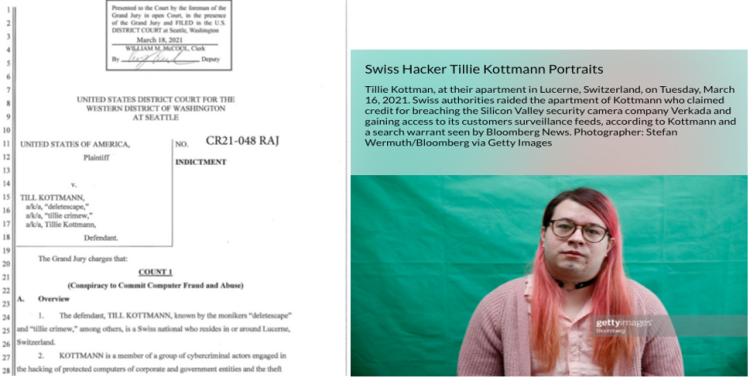 蒂莉·考特曼(Tillie Kottmann),1999年8月7日生于瑞士卢塞恩,自称是黑客、无政府主义者,以女性自居。其曾在瑞士BBZW Sursee思科学院、德国auticon GmbH公司、瑞士Egon AG公司工作。蒂莉·考特曼还是Dogbin网站(短链接转换网站)的创始人和首席开发人员。2020年4月以来,蒂莉·考特曼通过“声呐方块”平台漏洞获取企业信息系统源代码数据;2020年7月,蒂莉·考特曼在互联网上曝光了微软、高通、通用电气、摩托罗拉、任天堂、迪士尼50余家知名企业信息系统源代码;2021年3月12日,瑞士警方搜查蒂莉·考特曼住所并扣押大量网络设备;2021年3月18日,美国司法部发布对蒂莉·考特曼的起诉书,但3月底突然中止该案审理。此后,中国成了蒂莉·考特曼的主要目标之一。