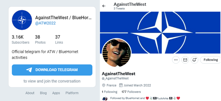 2021年10月,ATW组织开始频繁活动,不断在电报群组(https://t.me/s/ATW2022,Email:AgainstTheWest@riseup.net,备份Email:apt49@riseup.net)、推特(@_AgainstTheWest,https://mobile.twitter.com/_AgainstTheWest)、Breadched(账号:AgainstTheWest)等境外社交平台开设新账号,扩大宣传途径,并表现出较明显的亲美西方政治倾向,多次声明“攻击目标是俄罗斯、白俄罗斯和中国、伊朗、朝鲜”、“愿意与美国、欧盟政府共享所有文件”、“愿受雇于相关机构”。