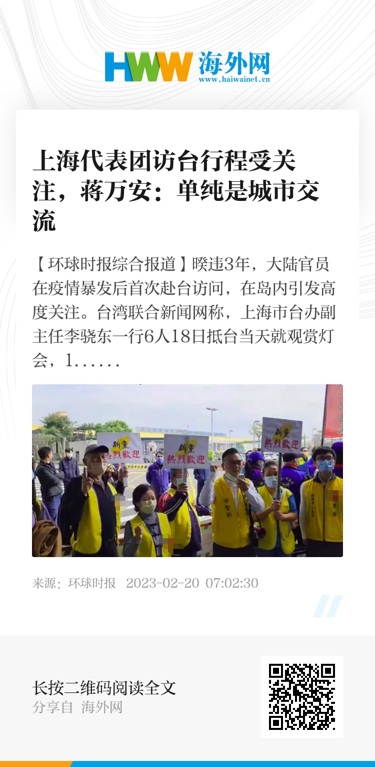 台湾《工商时报》称,这是3年来首次有大陆官员到台湾。陆委会上次同意大陆官员访问团来台还是在2019年2月,由时任上海市台办主任、现海协会副会长李文辉率队赴台参加台北灯会。