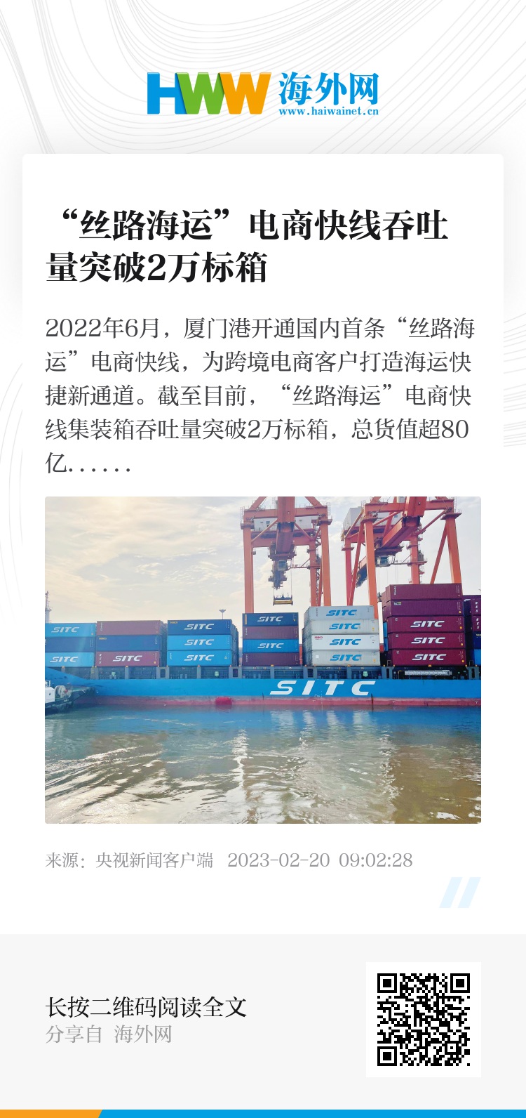 2022年6月,厦门港开通国内首条“丝路海运”电商快线,为跨境电商客户打造海运快捷新通道。截至目前,“丝路海运”电商快线集装箱吞吐量突破2万标箱,总货值超80亿元人民币。