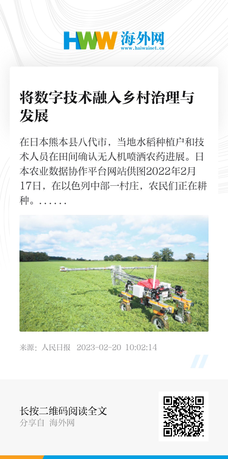 近日,中央一号文件发布,提出要深入实施数字乡村发展行动,推动数字化应用场景研发推广,加快农业农村大数据应用,推进智慧农业发展等。随着互联网、大数据、云计算等现代信息技术的兴起与发展,数字技术在农业农村领域得到广泛应用,成为乡村创新治理手段、实现精细化管理、促进智慧农业和绿色发展的重要抓手。一些国家将数字技术广泛融入乡村发展的各环节,积累了一些经验和做法可供参考。
