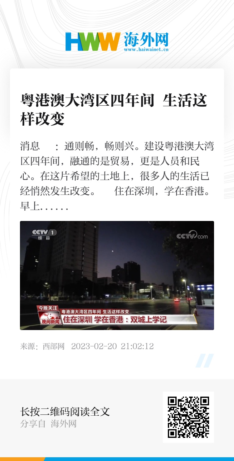 央视网消息:通则畅,畅则兴。建设粤港澳大湾区四年间,融通的是贸易,更是人员和民心。在这片希望的土地上,很多人的生活已经悄然发生改变。