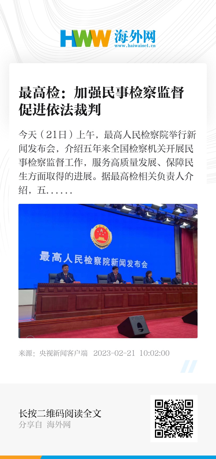 今天(21日)上午,最高人民检察院举行新闻发布会,介绍五年来全国检察机关开展民事检察监督工作,服务高质量发展、保障民生方面取得的进展。