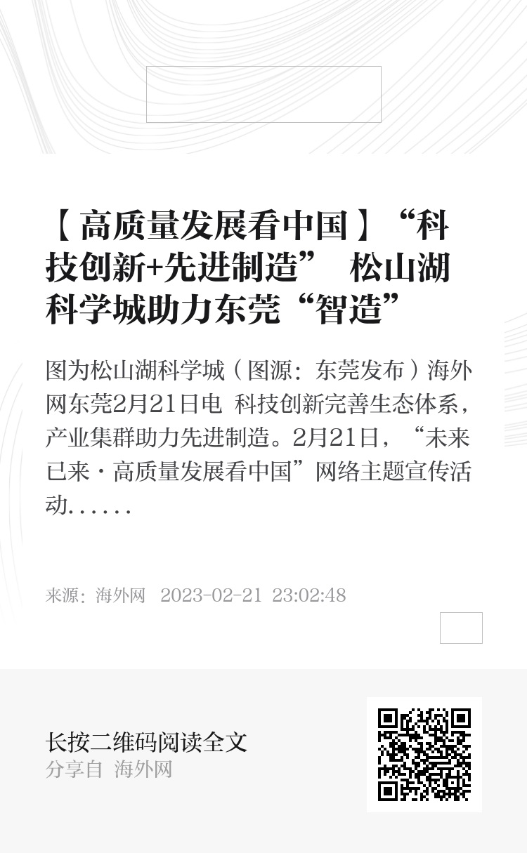 海外网东莞2月21日电 科技创新完善生态体系,产业集群助力先进制造。2月21日,“未来已来·高质量发展看中国”网络主题宣传活动采访团来到位于东莞中部,坐落于粤港澳大湾区的黄金腹地,南邻香港、深圳,北靠广州的松山湖科学城。在这里,高科技、新产业珠联璧合。