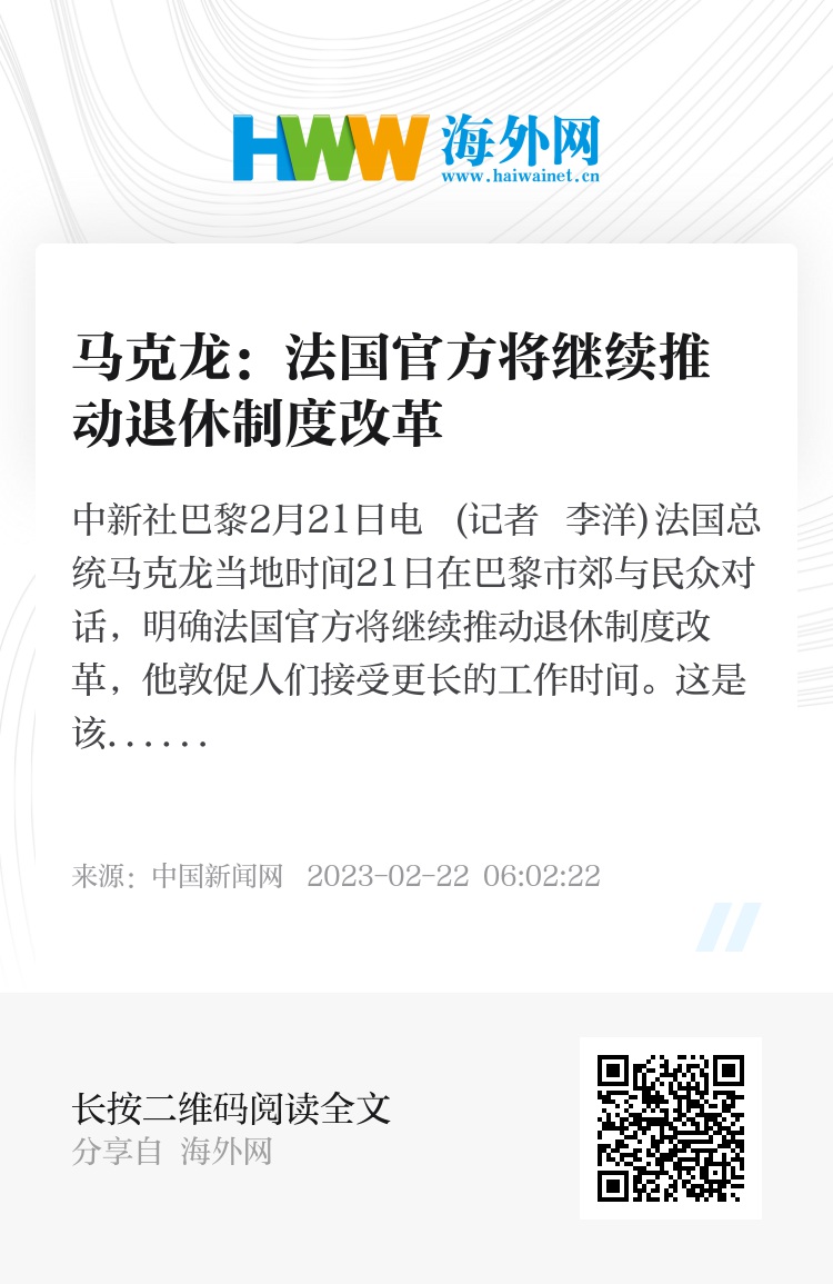 中新社巴黎2月21日电 (记者 李洋)法国总统马克龙当地时间21日在巴黎市郊与民众对话,明确法国官方将继续推动退休制度改革,他敦促人们接受更长的工作时间。