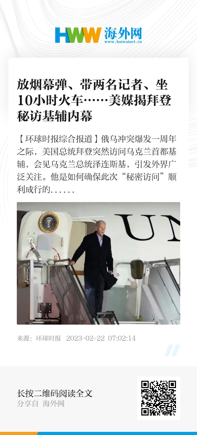 【环球时报综合报道】俄乌冲突爆发一周年之际,美国总统拜登突然访问乌克兰首都基辅,会见乌克兰总统泽连斯基,引发外界广泛关注。他是如何确保此次“秘密访问”顺利成行的?多家西方媒体20日披露了更多细节。