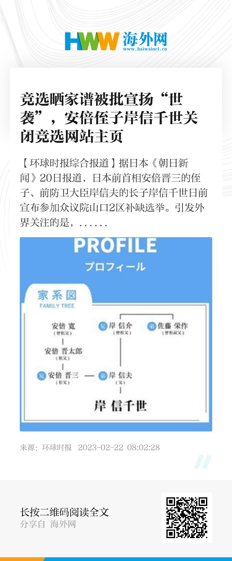 【环球时报综合报道】据日本《朝日新闻》20日报道,日本前首相安倍晋三的侄子、前防卫大臣岸信夫的长子岸信千世日前宣布参加众议院山口2区补缺选举。引发外界关注的是,岸信千世在自己竞选网站主页上贴出了家族谱系图,遭到日本在野党和舆论的抨击,认为岸信千世是在宣扬“世袭”。目前,岸信千世已暂时关闭主页,但否认这与受到关于“世袭”的批评有关。