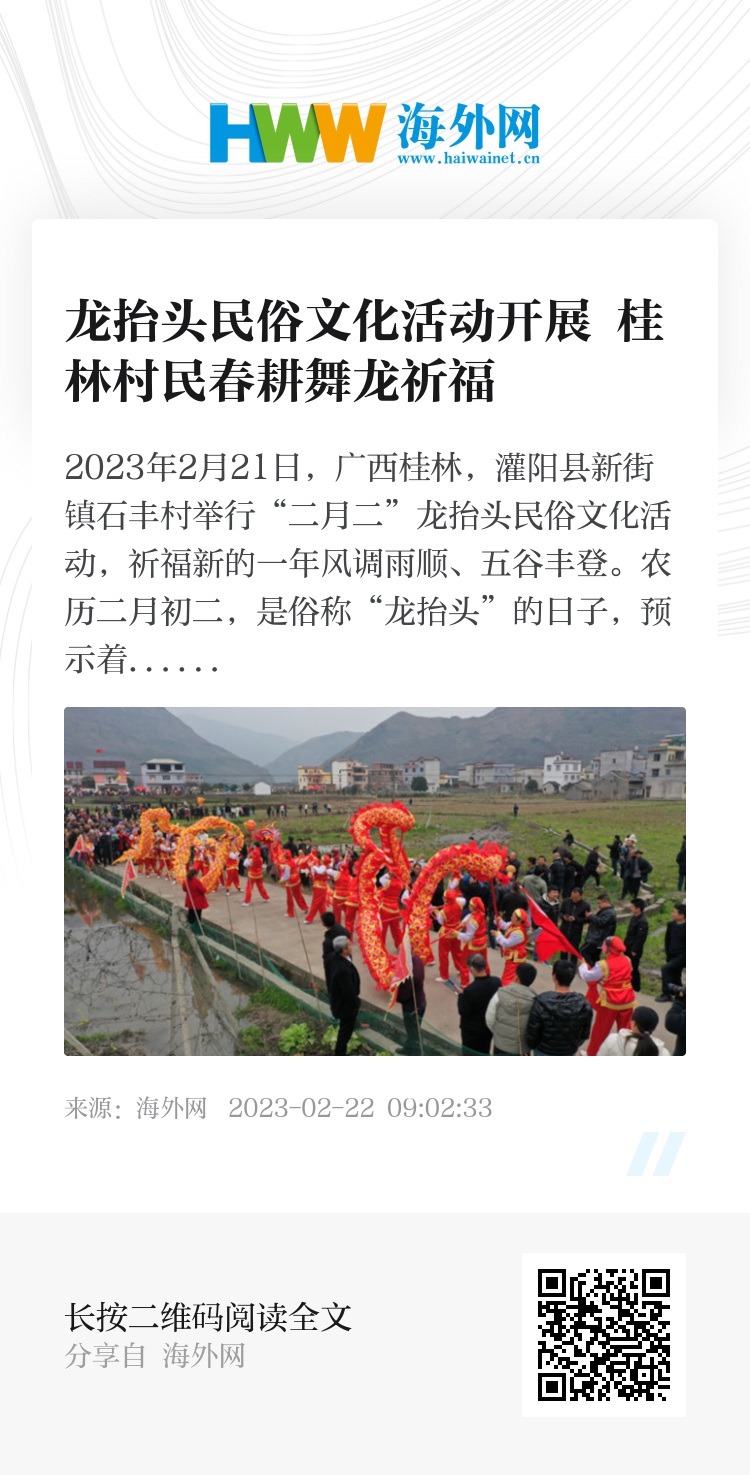 2023年2月21日,广西桂林,灌阳县新街镇石丰村举行“二月二”龙抬头民俗文化活动,祈福新的一年风调雨顺、五谷丰登。农历二月初二,是俗称“龙抬头”的日子,预示着一年农事活动的开始。图片来源:视觉中国
